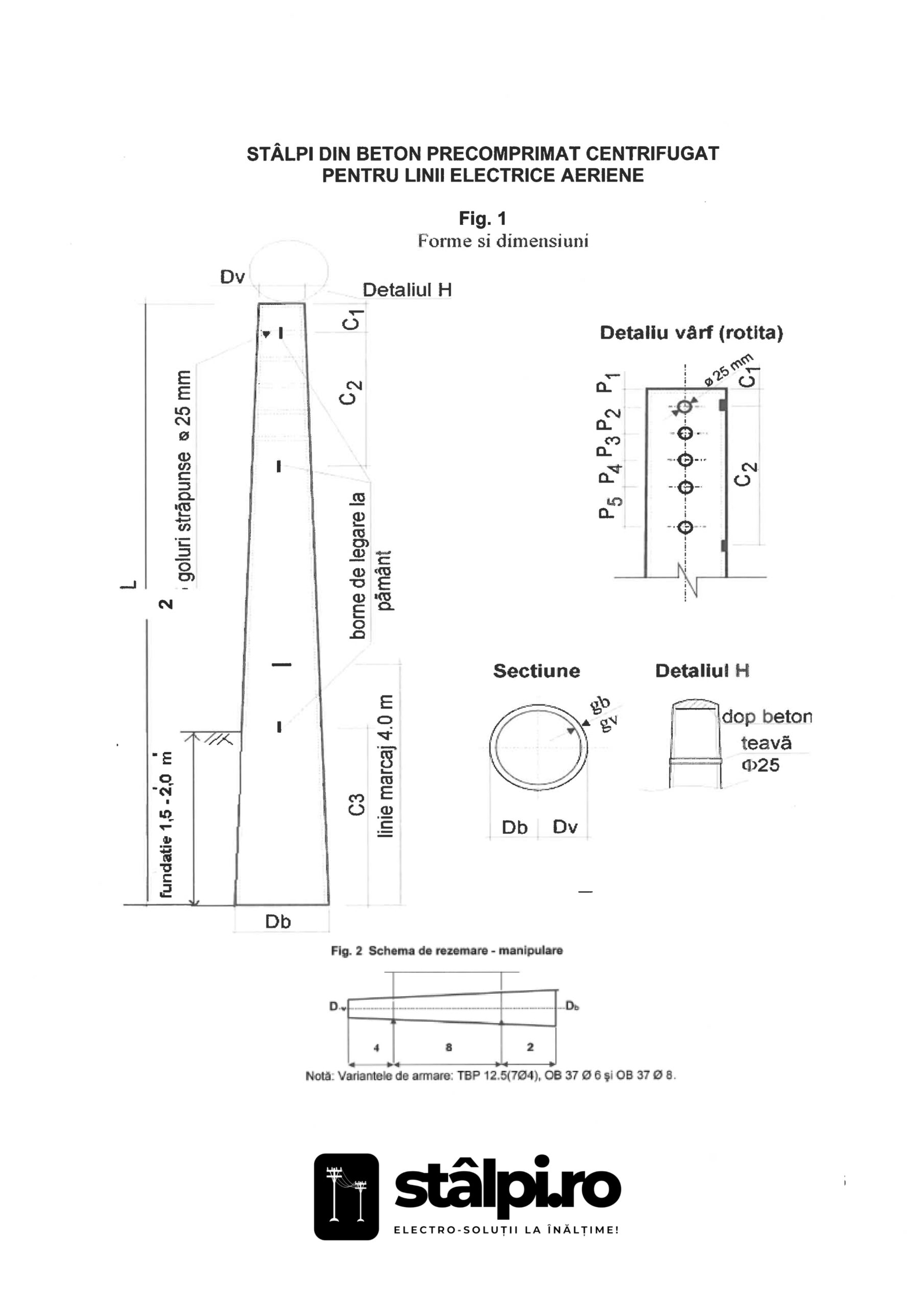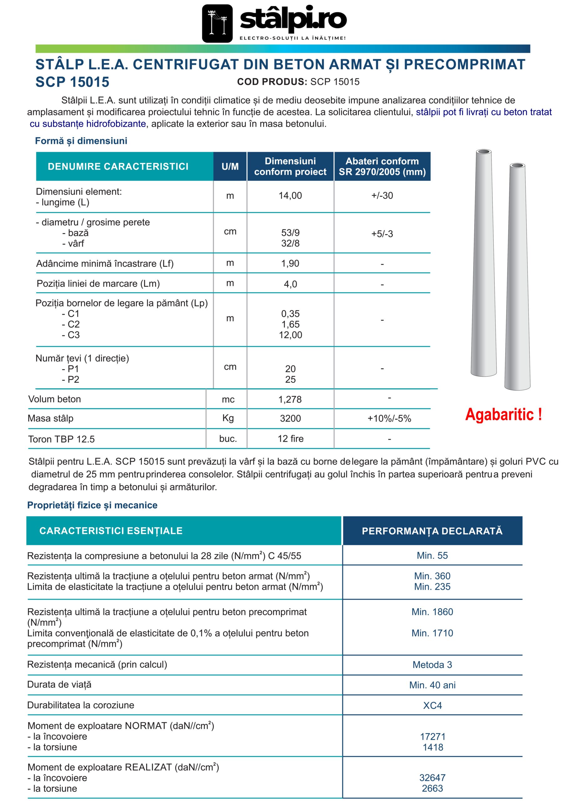 Stâlpi L.E.A. centrifugati din beton armat și beton precomprimat, având secțiunea circulară variabilă pe înălțime, cu miezul gol, utilizați la construcția liniilor electrice de joasă și medie tensiune.